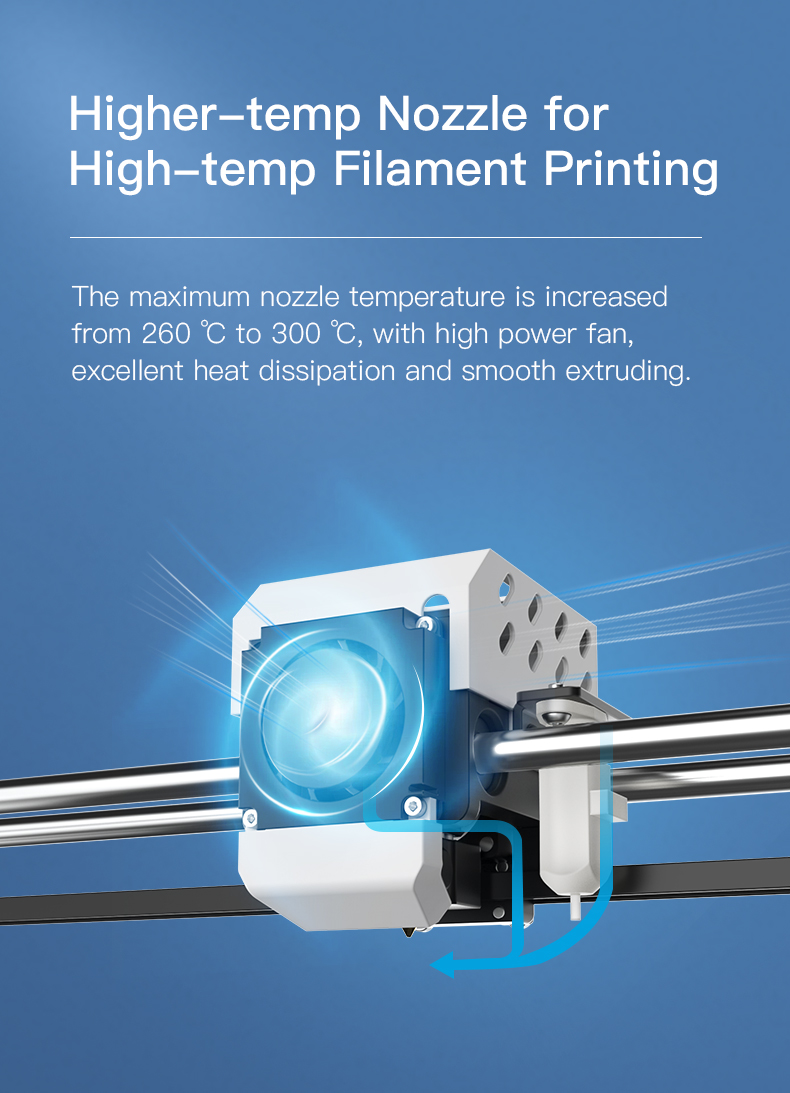 Met zijn grote installatieruimte en een maximale hotend-temperatuur tot 250 °C was de Creality CR-5 Pro H al een krachtige 3D-printer voor de hoogste eisen. Zijn opvolger, de Creality CR-5 Pro versie voor hoge temperaturen, neemt de kenmerken van zijn voorganger over en vertrouwt erop: de maximale nozzle temperatuur in de nieuwe versie voor hoge temperaturen is verhoogd tot 300 °C. Dit opent geheel nieuwe mogelijkheden bij het verwerken van hoge temperatuur filamenten.