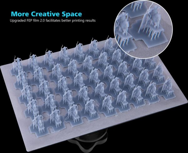 - Betere Printkwaliteit: De FEP-film zorgt ervoor dat de resin gemakkelijk loskomt van het bed, wat resulteert in minder hechting en minder risico op beschadiging van de gedrukte laag. Dit zorgt voor gladdere afwerkingen en een verbeterde precisie in je 3D-printprojecten.
