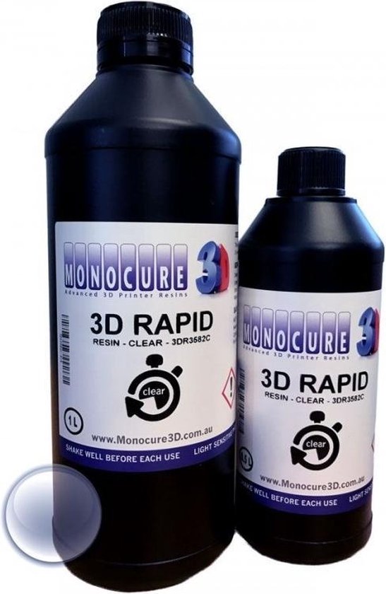 Monocure 3D Rapid Resin – 500 ml – Helder is de perfecte keuze voor makers die op zoek zijn naar een heldere, snel uithardende UV-hars die zorgt voor uitstekende precisie en gedetailleerde 3D-afdrukken. Dit hoogwaardige UV-resin is ontworpen voor gebruik met SLA en DLP 3D-printers, waardoor het ideaal is voor een breed scala aan toepassingen zoals prototypen, sieraden, figuren, en technische onderdelen.